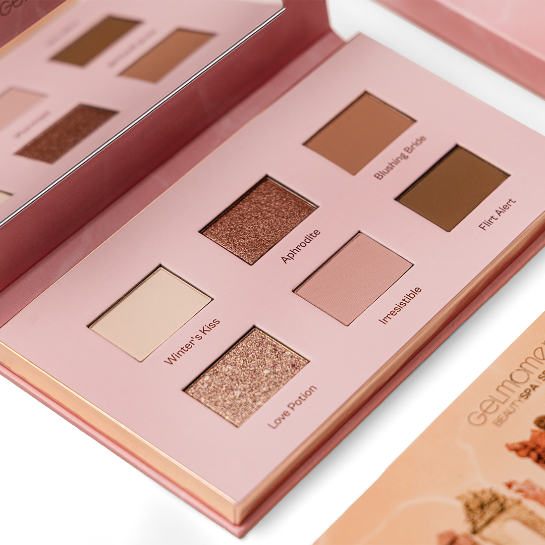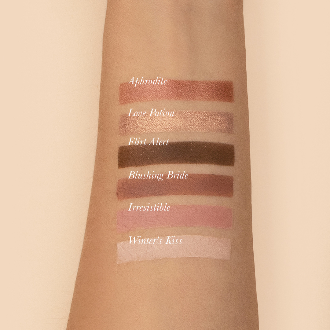 See the world through rose-coloured eyelids with the lovely tones of TOUJOURS Pink Palette: Winter’s Kiss, Aphrodite, Blushing Bride, Love Potion, Irresistible, and Flirt Alert.